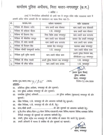 बस्तर जिले के पुलिस विभाग में बड़े स्तर पर प्रशासनिक बदलाव किए गए हैं। पुलिस अधीक्षक शलभ सिंहा के आदेश के तहत कुल 10 थाना प्रभारियों और निरीक्षकों के कार्यक्षेत्र बदले गए हैं। अधिकारियों का कहना है कि यह कदम विभागीय कार्यकुशलता बढ़ाने और कानून-व्यवस्था को मजबूत करने के लिए उठाया गया है।