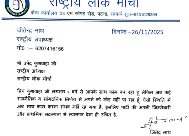 पार्टी राष्ट्रीय लोक मोर्चा (आरएलएम) के राष्ट्रीय उपाध्यक्ष जितेंद्र नाथ ने पार्टी के राष्ट्रीय अध्यक्ष उपेंद्र कुशवाहा को एक इस्तीफा पत्र लिखा। इस पत्र में उन्होंने कहा, “प्रिय कुशवाहा जी, मैं लगभग 9 वर्षों से आपके साथ काम कर रहा हूं, लेकिन अब मैं कई राजनीतिक और संगठनात्मक निर्णयों को अपने आप से नहीं जोड़ पा रहा हूं। ऐसे हालात में आपके साथ काम करना मेरे लिए संभव नहीं रहा है, इसलिए यह आवश्यक समझता हूं कि मैं पार्टी की सदस्यता और जिम्मेदारियों से इस्तीफा दूं।“