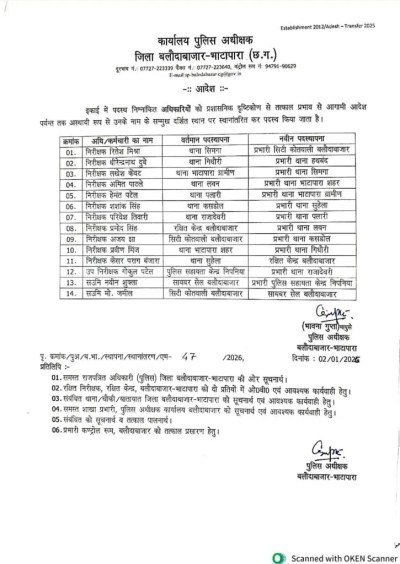 नए वर्ष की शुरुआत के साथ ही प्रदेशभर में प्रशासनिक गतिविधियां तेज हो गई हैं और विभिन्न विभागों में तबादलों का सिलसिला शुरू हो चुका है। इसी क्रम में बलौदाबाजार-भाटापारा जिले के पुलिस महकमे में बड़ा प्रशासनिक फेरबदल देखने को मिला है।
