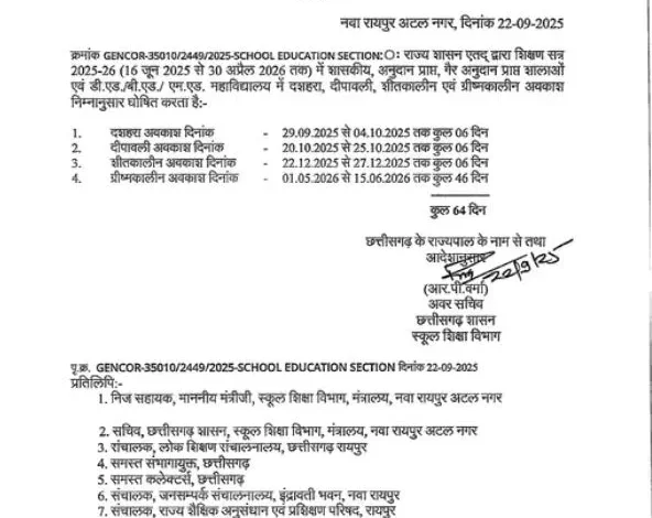 छत्तीसगढ़ के स्कूलों में 2025-26 में कुल 64 दिन की छुट्टियां रहेंगी। दशहरा और दिवाली पर 8-8 दिन, शीतकालीन अवकाश 8 दिन और ग्रीष्मकालीन अवकाश 46 दिन का होगा