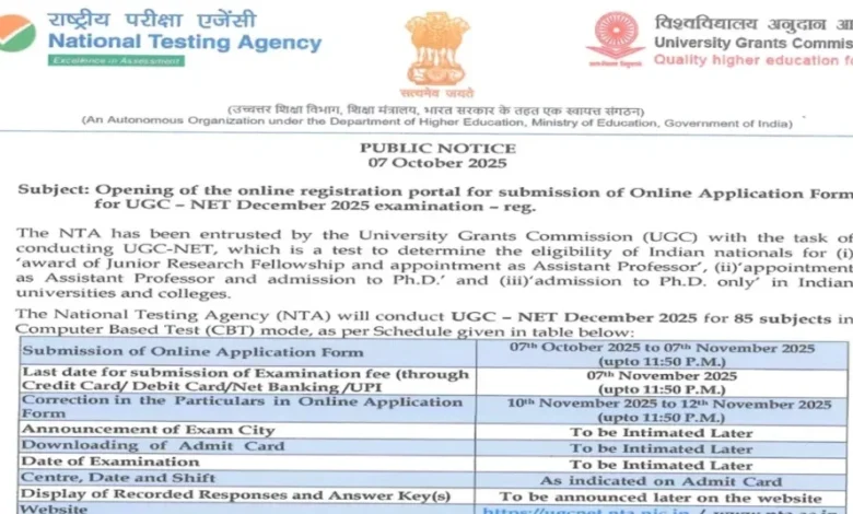 राष्ट्रीय परीक्षण एजेंसी (NTA) ने UGC NET दिसंबर 2025 परीक्षा के लिए आधिकारिक नोटिफिकेशन जारी कर दिया है। यूजीसी नेट दिसंबर परीक्षा के लिए रजिस्ट्रेशन प्रक्रिया आज 7 अक्टूबर 2025 से शुरू हो गई है। इच्छुक और योग्य उम्मीदवार एनटीए की आधिकारिक वेबसाइट ugcnet.nta.ac.in पर जाकर ऑनलाइन आवेदन कर सकते हैं।