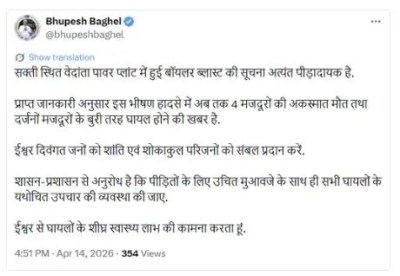 मुख्यमंत्री विष्णु देव साय ने सक्ती जिले के सिंघीतराई स्थित वेदांता पावर प्लांट में बॉयलर फटने से हुई दुर्घटना पर गहरा दुःख व्यक्त किया है। उन्होंने इस घटना को अत्यंत पीड़ादायक और हृदय विदारक बताते हुए मृतकों के प्रति श्रद्धांजलि अर्पित की तथा शोक संतप्त परिजनों के प्रति अपनी गहरी संवेदनाएँ प्रकट की हैं। वहीं पूर्व सीएम भूपेश बघेल ने एक्स पर लिखा- पीड़ितों के लिए उचित मुआवजे और घायलों के उपचार की व्यवस्था की जाए।